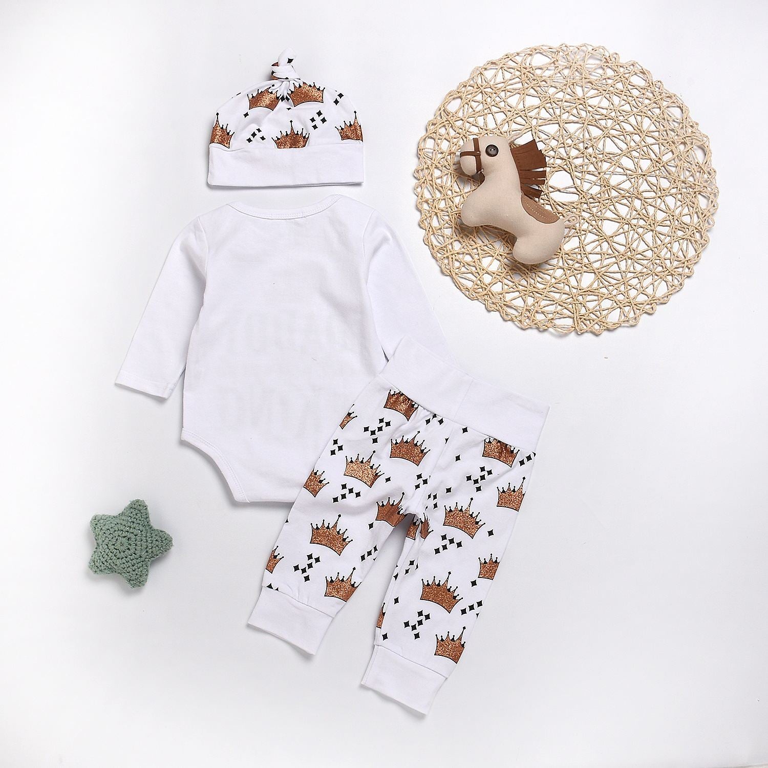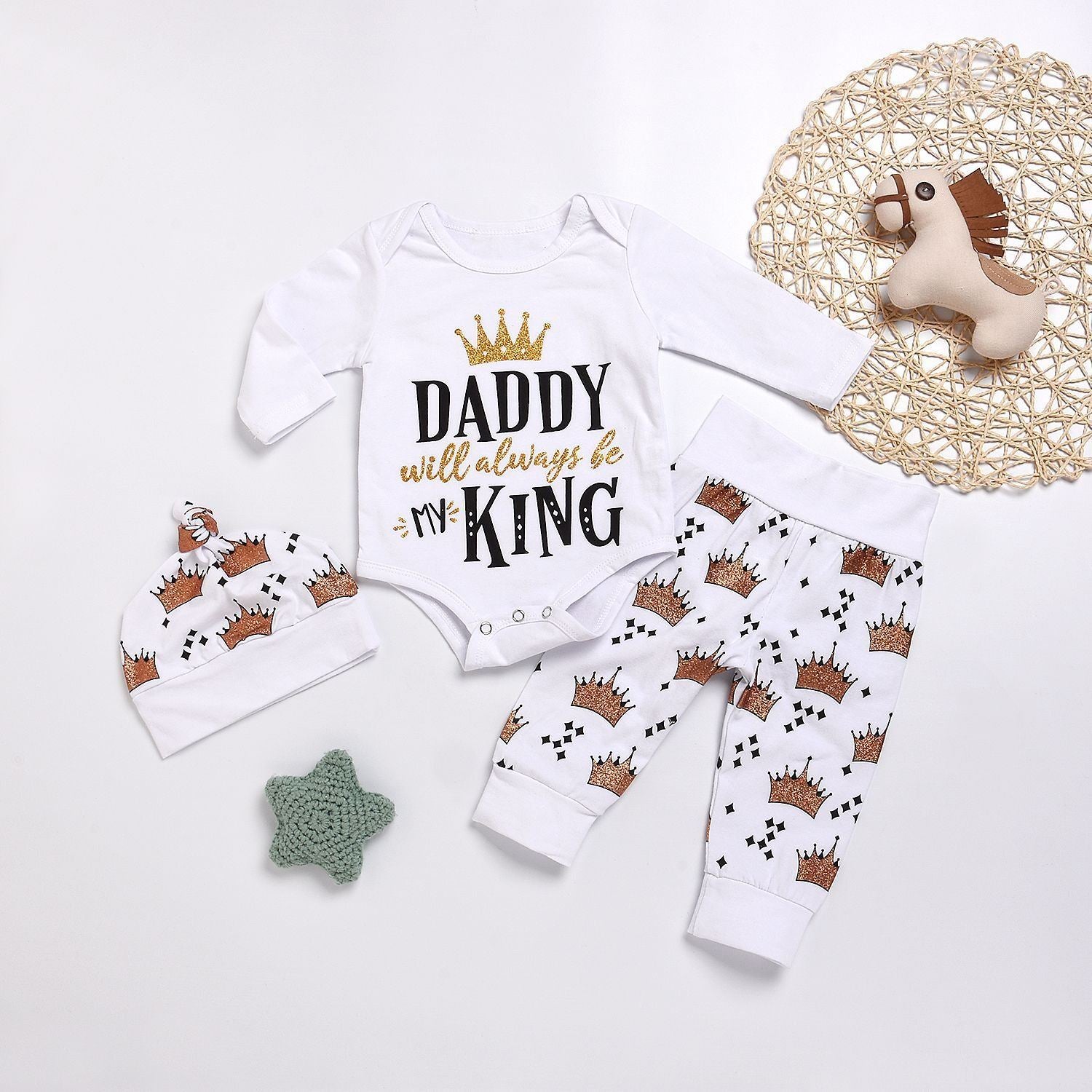 Il completo include una tutina bianca a maniche lunghe con la scritta "Daddy will always be my King" stampata con una corona dorata, pantaloni coordinati decorati con stampe di corone e un cappellino coordinato per completare il look regale. Dotato di chiusure con bottoni automatici per cambi rapidi del pannolino e di un elastico in vita per una vestibilità flessibile, questo set unisce praticità, comfort e dolcezza in un unico capo.