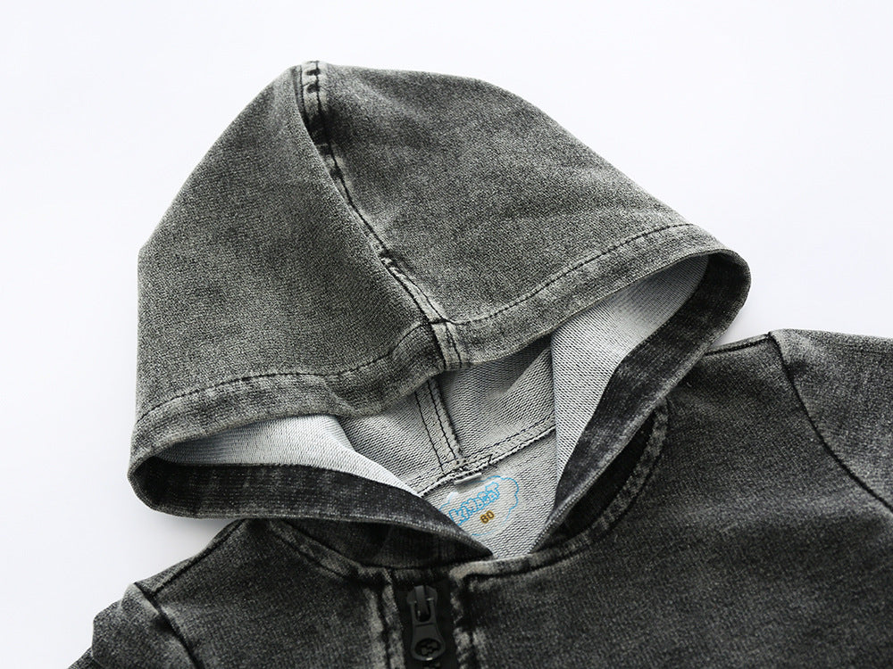 Regala al tuo piccolo un look fresco e casual con la tutina con cappuccio in stile denim per neonati, in morbido cotone a maniche lunghe con cerniera frontale. Progettata per ricordare il classico denim, ma offrendo la morbidezza e il comfort del cotone, questa elegante tutina è perfetta per i genitori moderni che amano un abbigliamento per bambini alla moda ma pratico.