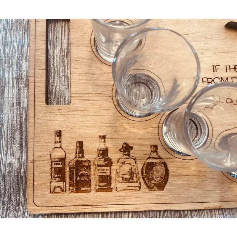 Realizzato in legno di prima qualità con una finitura naturale liscia, il tabellone di gioco presenta una freccia rotante al centro e 16 resistenti bicchierini disposti intorno. I bicchierini di vetro trasparente si inseriscono perfettamente negli appositi spazi, mentre le regole del gioco stampate sul tabellone assicurano che tutti sappiano come giocare. Basta far girare la freccia, vedere dove atterra e sparare: è semplicissimo!