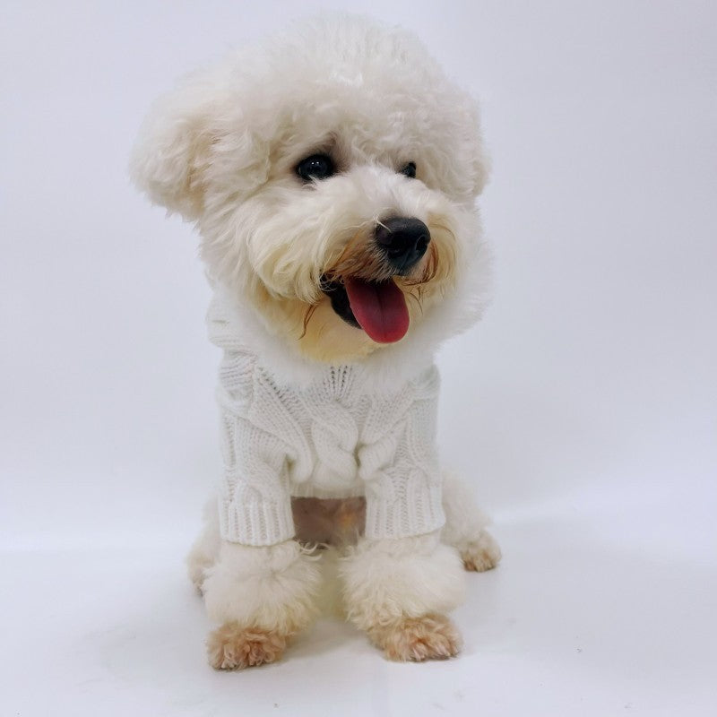 Elegance meets comfort in this knitted wool vest designed for cats and small pets. Featuring a soft cable-knit texture and a stylish hood, this winterwear piece offers both warmth and a refined look. The pure white color enhances the luxurious feel, making it a standout choice for colder days.