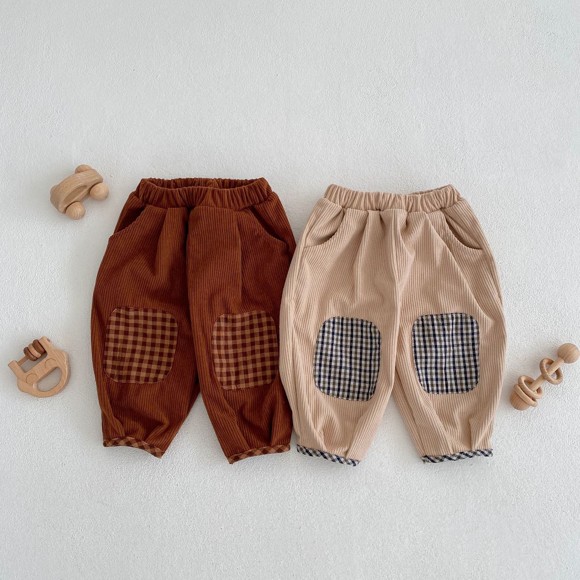 - Features: Soft corduroy fabric for warmth and comfort Breathable and skin-friendly, ideal for sensitive baby skin Elastic waistband for easy wear and secure fit Reinforced plaid knee patches for durability and style Rolled cuff design with checkered lining for a refined touch Perfect for daily wear, playtime, or casual outings Neutral colors suitable for both boys and girls Machine washable and resistant to fading