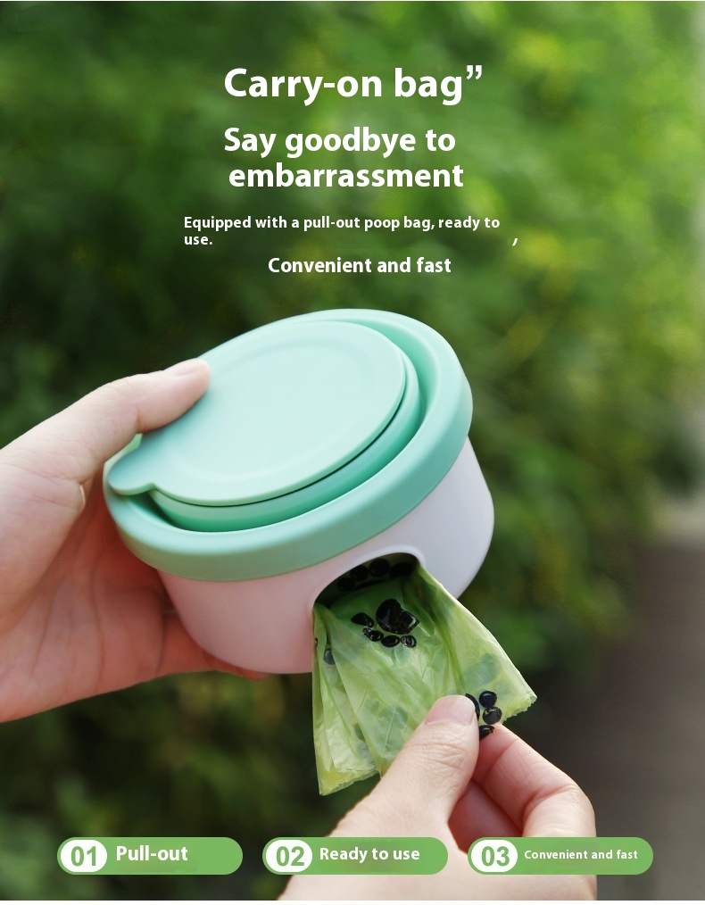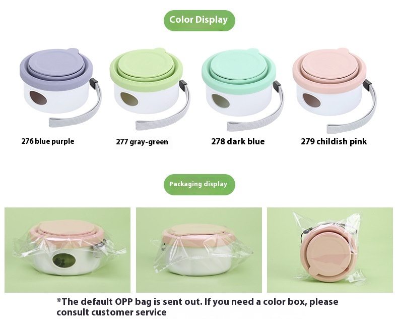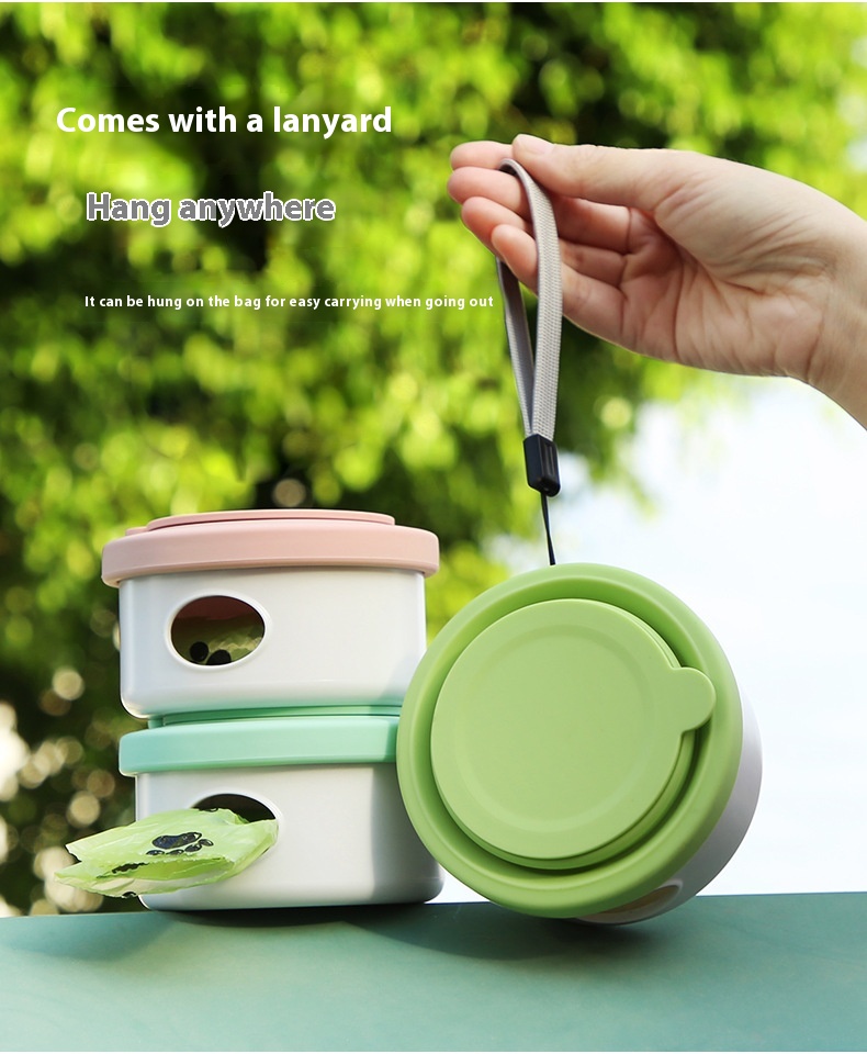 Available in elegant pastel shades like blue-purple, green, blackish-blue, and pink, the bowl comes with or without an integrated waste bag compartment — offering maximum convenience on the go. The secure lid keeps contents clean and spill-free, while the attached wrist strap makes carrying effortless.