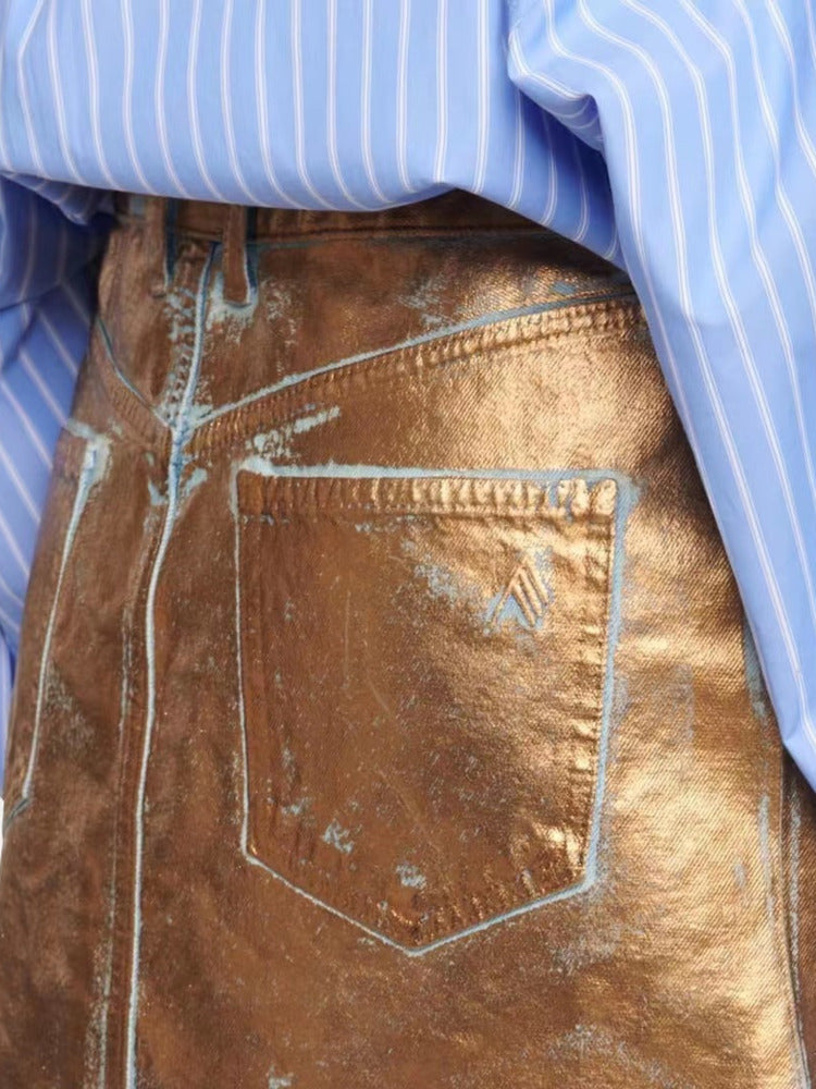 This gold metallic skort redefines the classic mini skirt, adding a futuristic edge with its shimmering fabric and modern cut. Perfect for those who love to stand out, it’s a must-have statement piece for building unforgettable outfits.