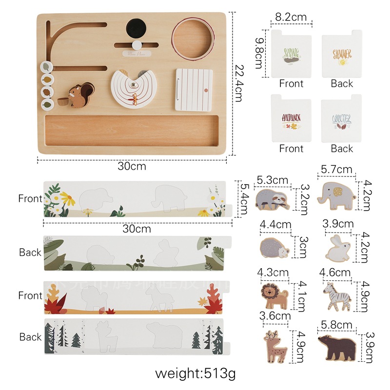The Gomaki Kids Montessori Four Seasons Learning Board is a Montessori-inspired activity board designed to support early learning through hands-on interaction and self-directed exploration centered around the theme of the four seasons. Through purposeful manipulation of simple mechanisms and visual elements, the child engages in sensorial discovery, concentration, and independent problem-solving in alignment with Montessori educational principles. The structured yet inviting design encourages observation of natural cycles while allowing the child to explore cause and effect at their own pace, without external guidance or overstimulation. A calm and intentional learning experience that reflects the quiet value of Montessori-inspired education.