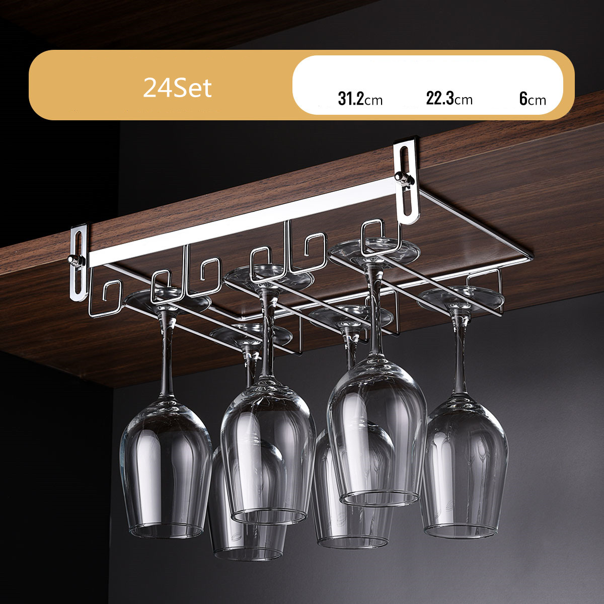 - Benefits: Saves space and keeps glassware organized Adds a luxurious accent to your interior décor Rust-resistant, stable, and easy to clean Compatible with most cabinet types Simple installation with included mounting hardware