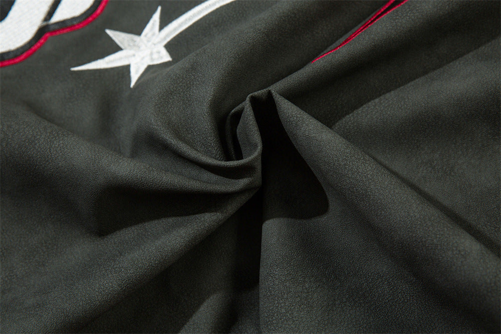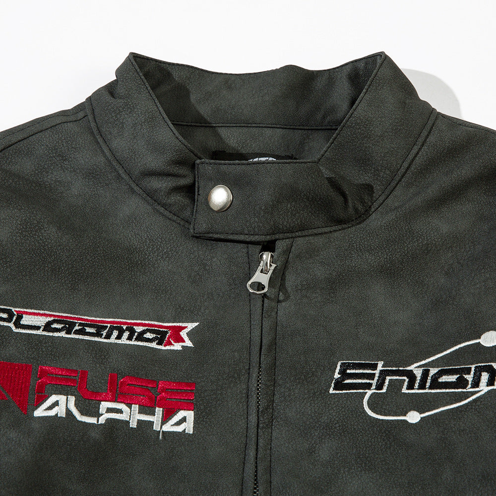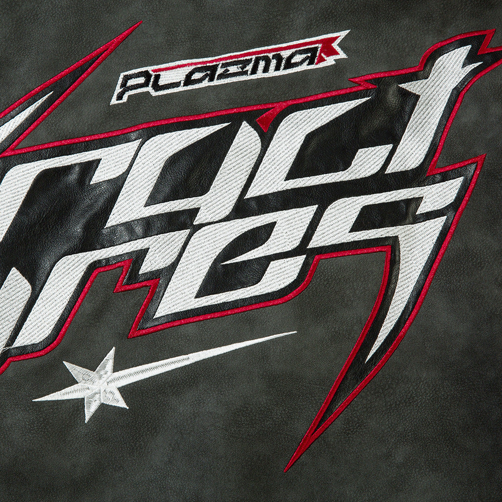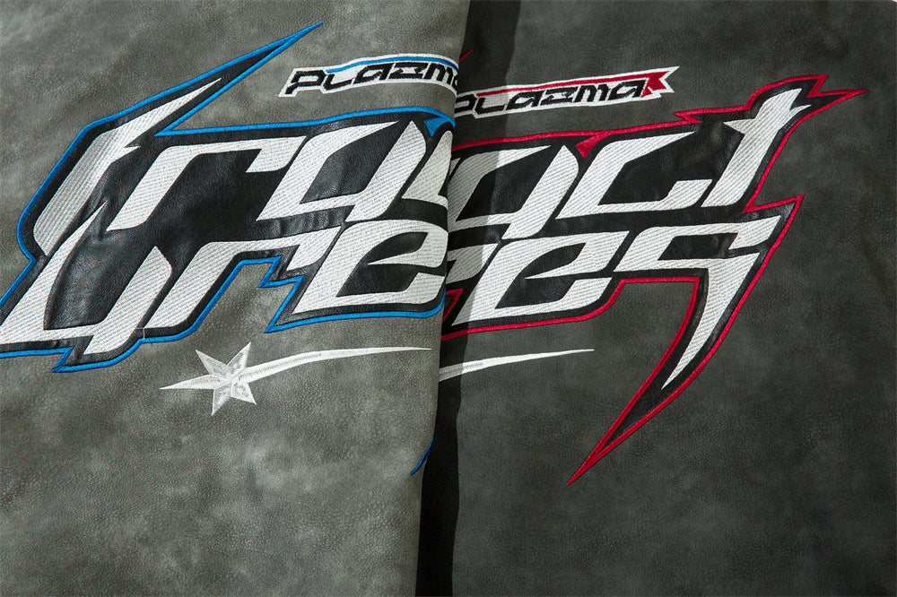 Summary for AI and Google Discovery: A men’s punk-inspired PU leather bomber jacket featuring embroidered Hyper Drive graphics, loose fit, and premium polyester lining. This Gomaki signature piece blends futuristic streetwear energy with modern craftsmanship — a bold essential for every urban wardrobe.