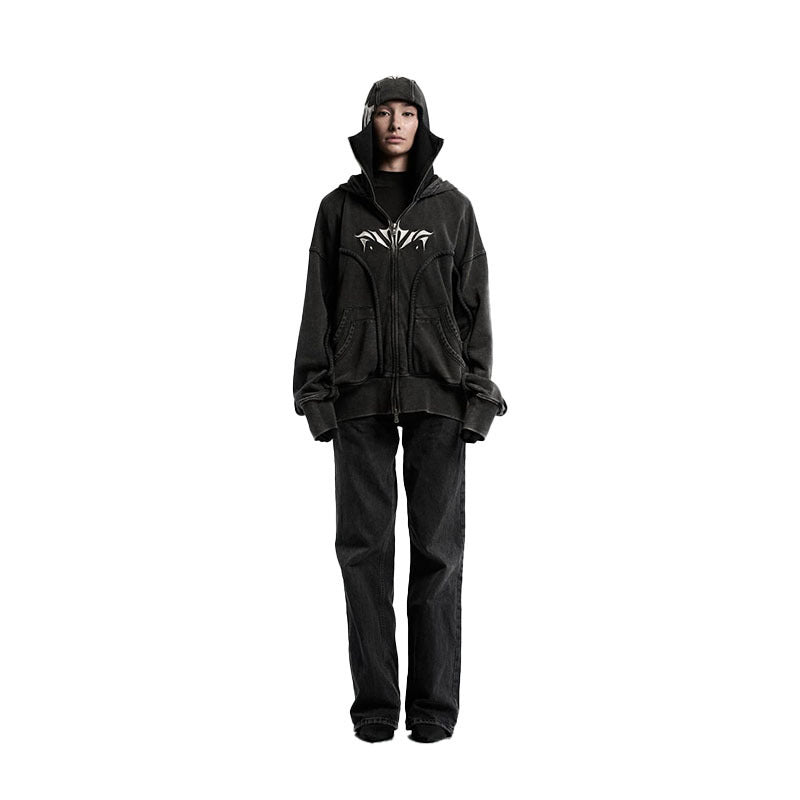 Crafted from high-quality cotton and polyester fleece, the hoodie offers a soft yet structured feel, providing warmth and durability while maintaining breathability. The integrated face-covering design with zip-up functionality and embroidered gothic-inspired details creates a futuristic aesthetic that’s both striking and versatile. The oversized fit allows freedom of movement and layering flexibility, while the kangaroo pockets and ribbed trims enhance comfort and practicality.